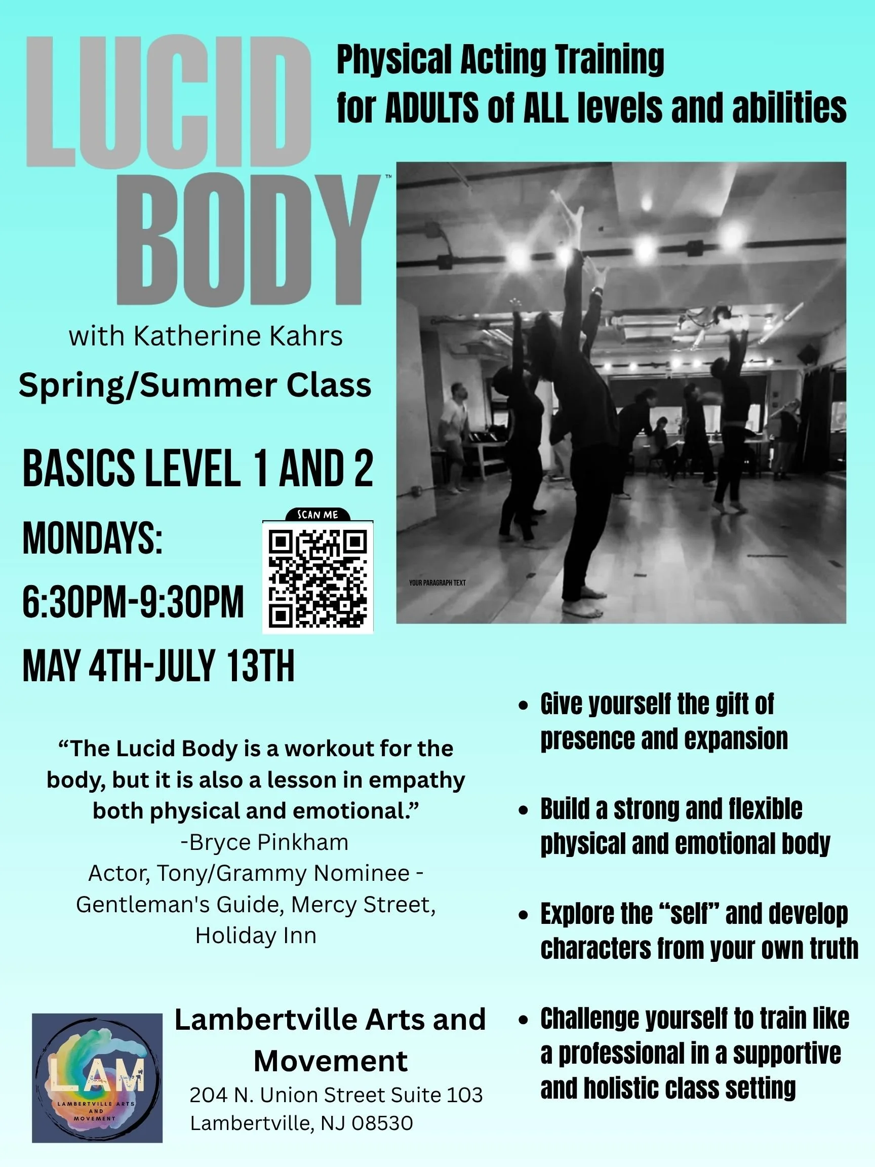 Lucid Body is an exciting physical acting process that guides students out of their heads and into embodiment and presence. Students learn how to develop truthful characters and create realistic human relationships from their own truth. Whether you are a professional, a community actor, or completely new to acting, if you are seeking to expand and develop your craft THIS IS YOUR CLASS! Offered in cities like NYC, LA and London, now New Jersey and eastern PA resident actors have access to this incredible class.